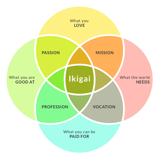 I find the Japanese practice of Ikigai can be a useful tool to take our exploration of purpose into the realm of the professional. The Japanese did not intend it that way; they use it more as a life mapping tool to identify purpose and meaning… the profession piece is definitely more derived from Western influence and promulgation. Ikigai is a confluence of four critical streams: your passion (what inspires you), your mission (what the world is yearning for), your vocation (what you excel at), and your profession (what sustains you financially).